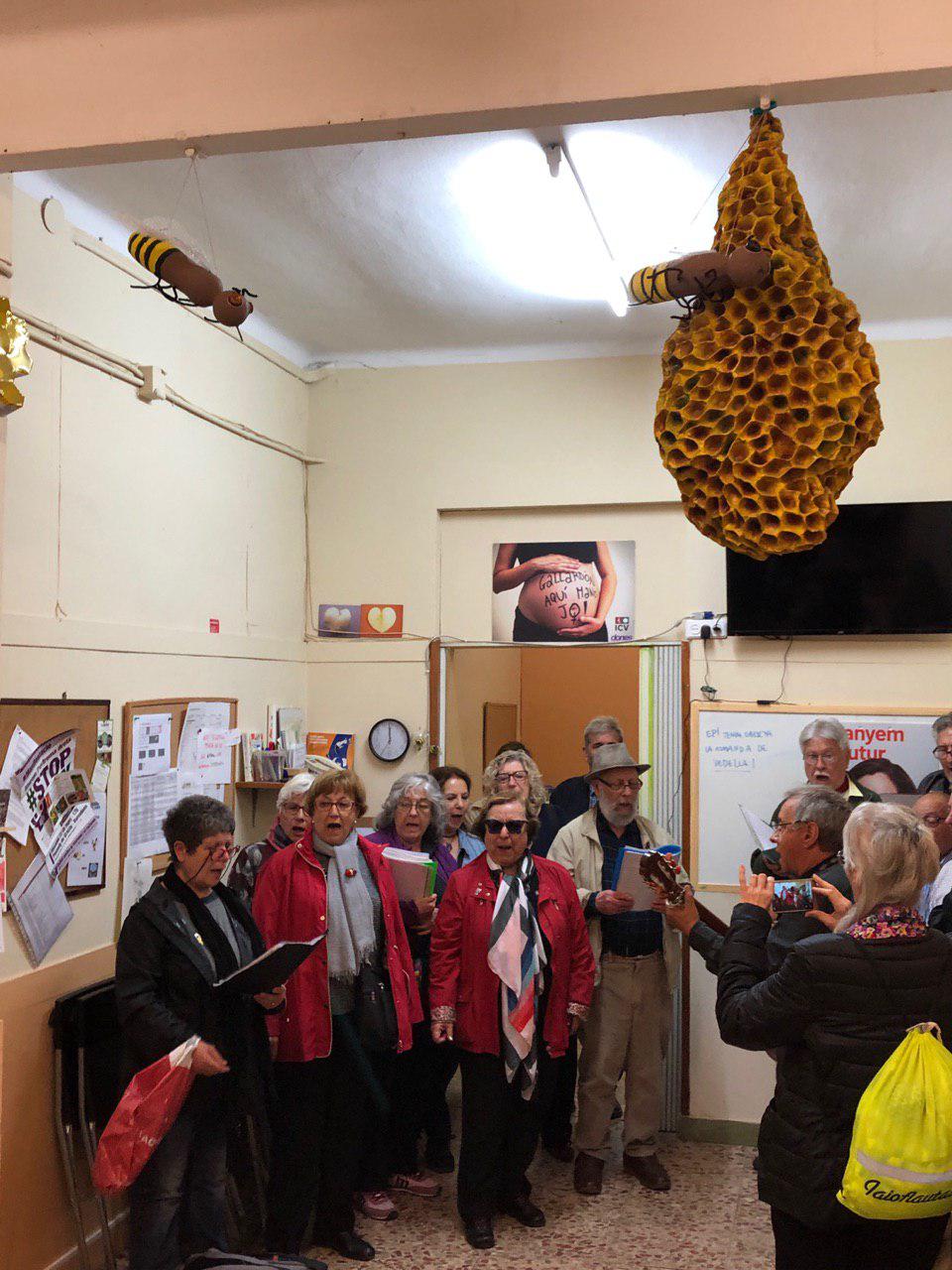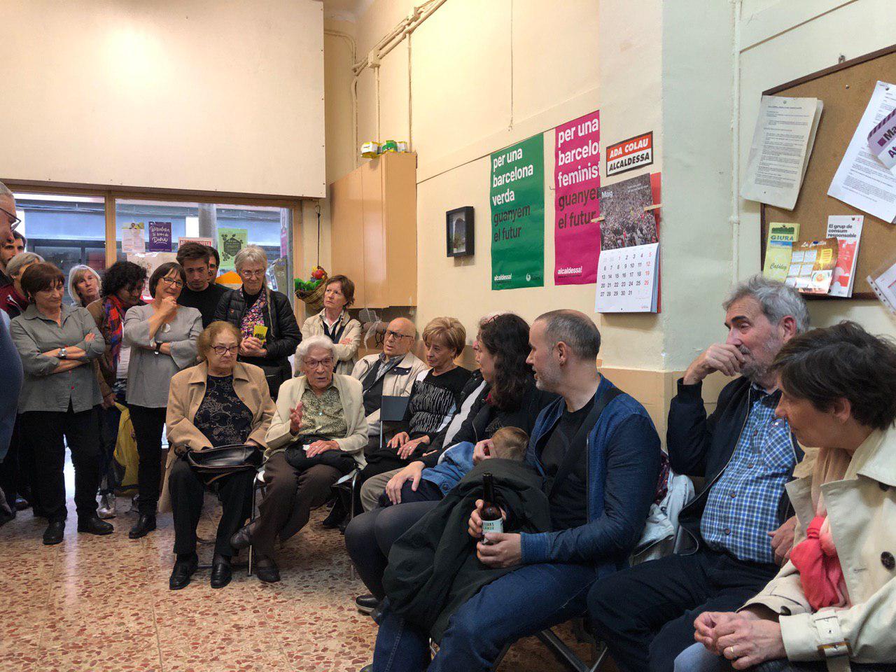 Ella mateixa ens va acompanyar en la trobada a la que van assistir totes les persones de les tres entitats que comparteixen el local: Gràcia en Comú, la Cooperativa de Consum El Rusc i l’Associació de Mujeres Migrantes Diversas. També va assistir el cor dels iaioflautes, que li van cantar la Cançó de la Dona Lliure.